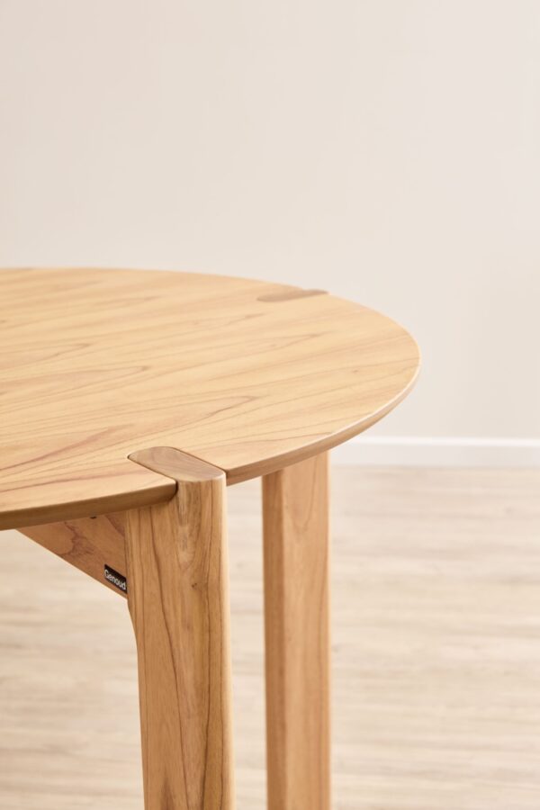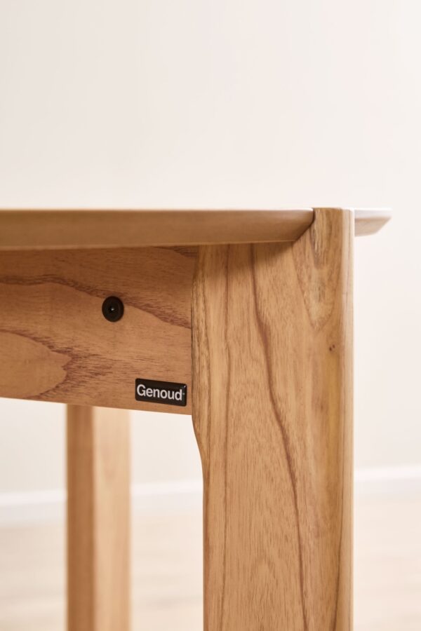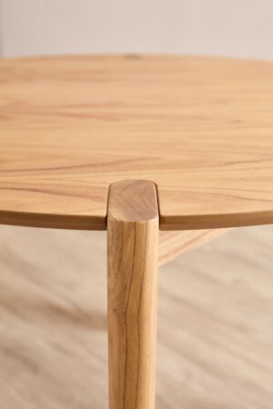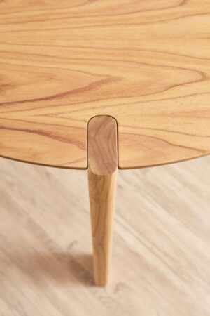 Cuenta con cuatro patas de sección rectangular ubicadas en forma de cruz, con las esquinas suavemente redondeadas, lo que refuerza su lenguaje amable y fluido. Un detalle distintivo y con gran personalidad es el modo en que cada pata atraviesa la tapa de la mesa, dejando visible su silueta en la superficie. Este gesto estructural no solo aporta carácter, sino que también revela la honestidad constructiva del diseño, convirtiendo un elemento funcional en un recurso estético destacado.