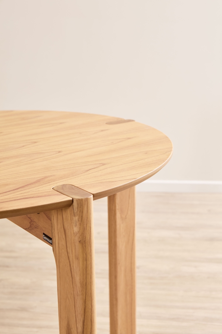 La tapa circular presenta un sutil redondeo y bordes biselados en todo el contorno. Estas cualidades estilizan y hacen que la percepción de la mesa sea visualmente más liviana, otorgando una sensación de sutileza.