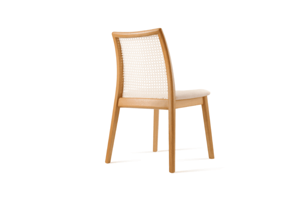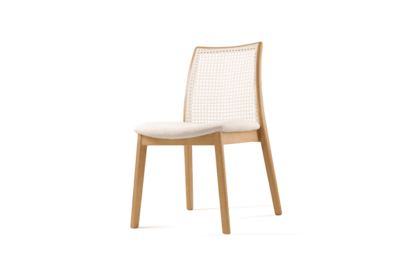 Estructura de madera maciza, acabado en barniz de poliuretano, asiento acolchado con espuma D28, respaldo en ratán natural. Disponible en roble y castaño.