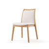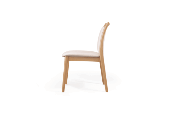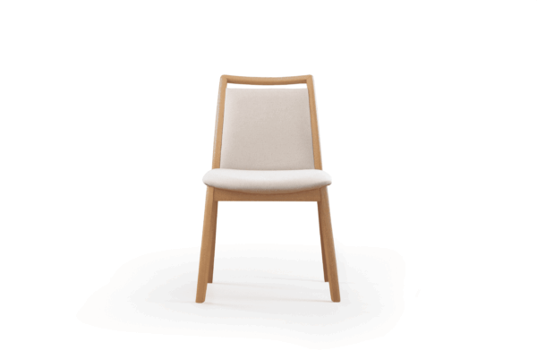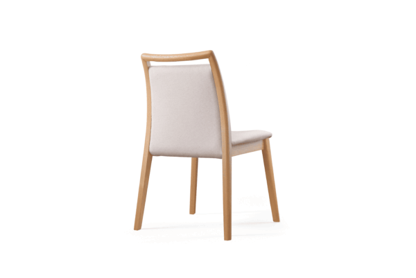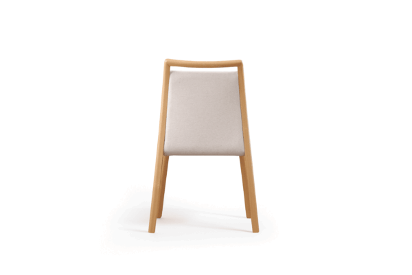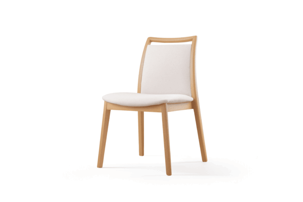 Estructura de madera maciza, acabado en barniz de poliuretano, asiento acolchado con espuma D28, respaldo acolchado. Disponible en roble.